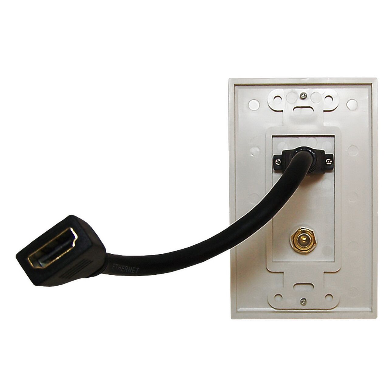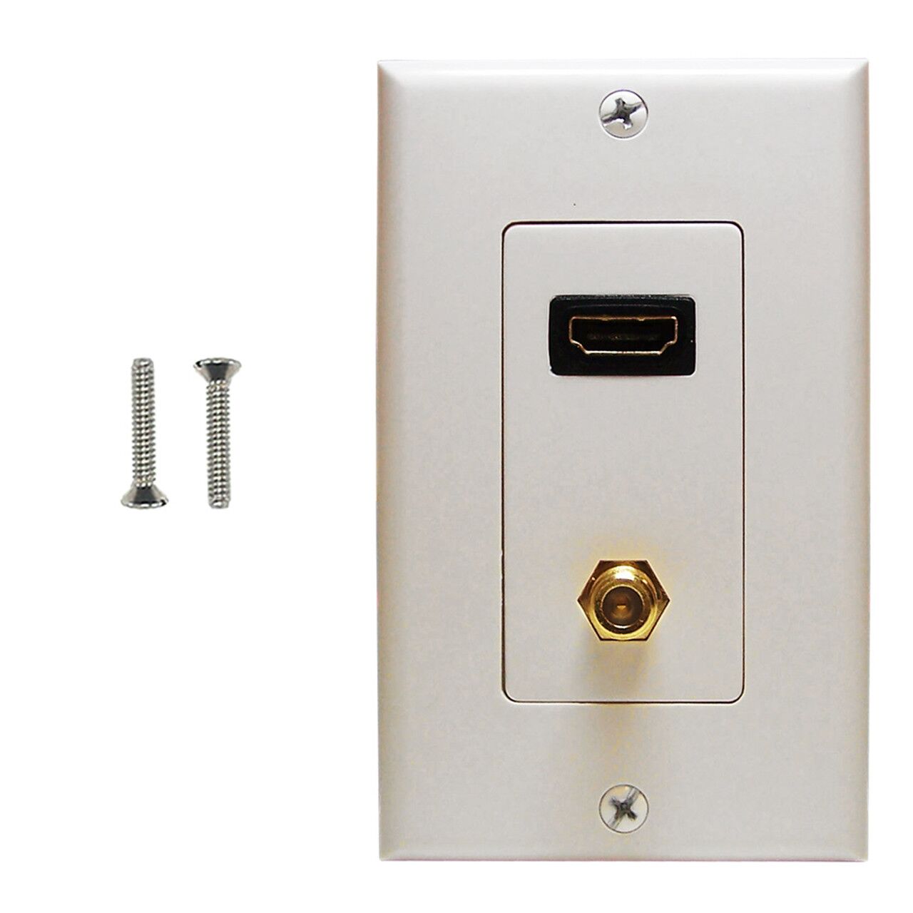 This wall plate kit consists of a wall plate, an HDMI female to female insert, and a F-type female to female insert. It is compatible with standard North American electrical openings, data clips or surface mount boxes.