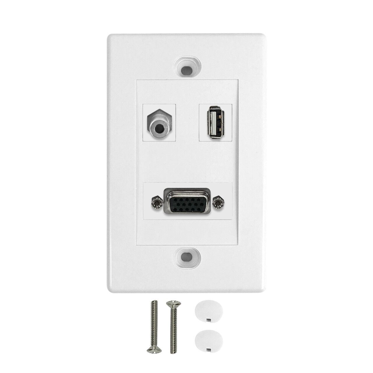 This wall plate kit consists of a wall plate, a VGA female to female port, a USB female to female port, and a 3.5mm female to female port. It is compatible with standard North American electrical openings, data clips or surface mount boxes.