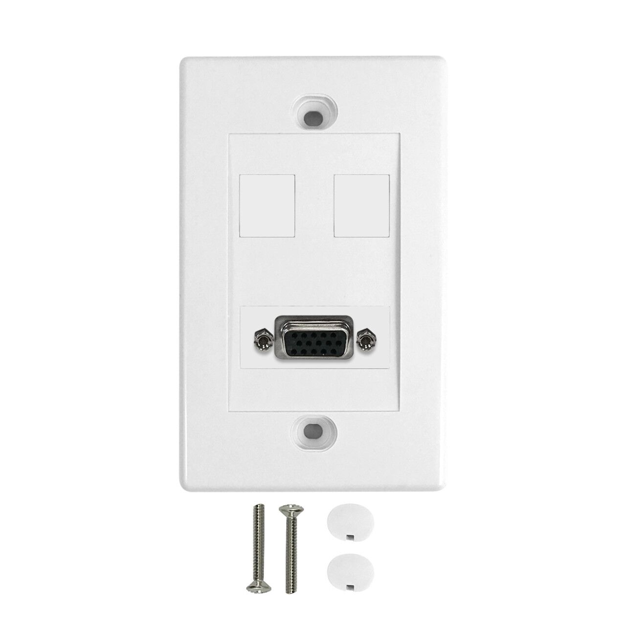 This wall plate kit consists of a VGA female to female insert, and 2 standard keystone inserts. It is compatible with standard North American electrical openings, data clips or surface mount boxes.