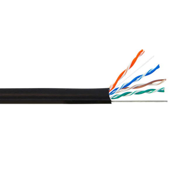 This bulk outdoor rated Cat5e cable with messenger is 1000 feet in length and consists of 4 pairs of 24AWG solid wires. It is typically used outdoors as an aerial cable as premise wiring to connect network devices.