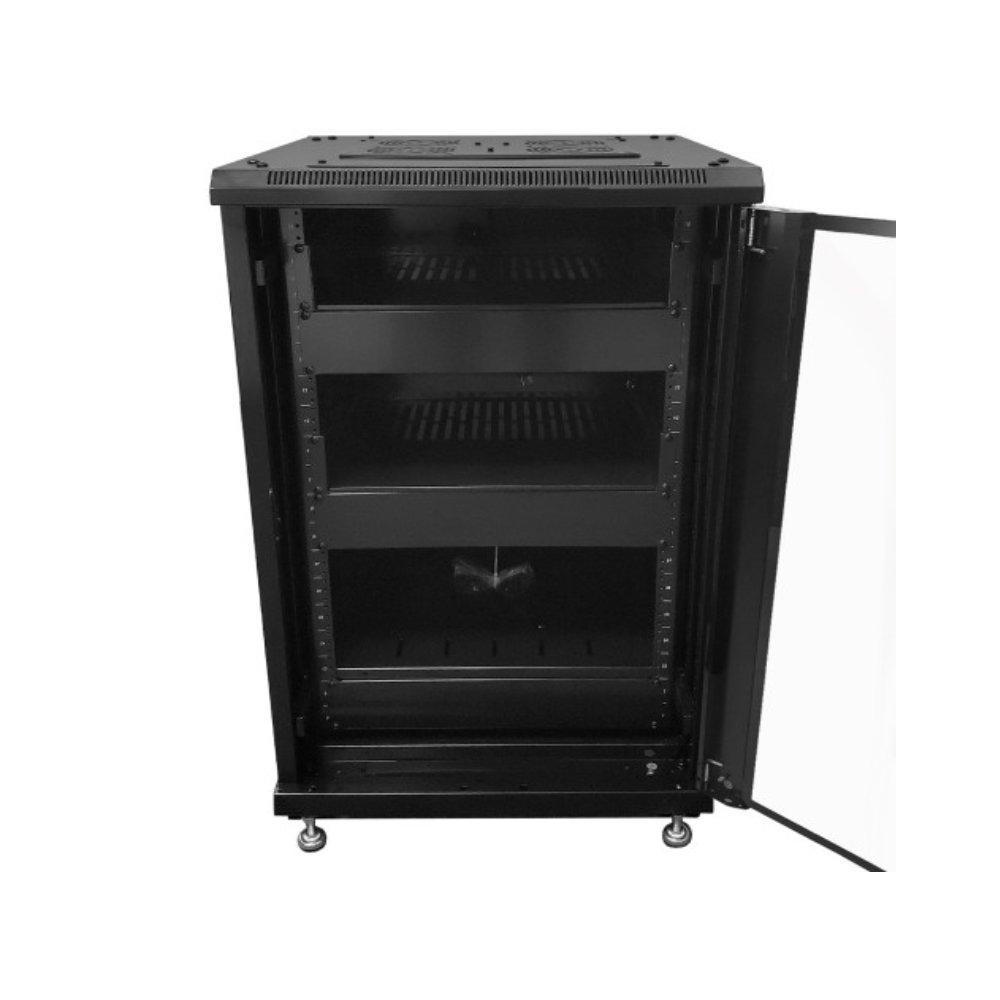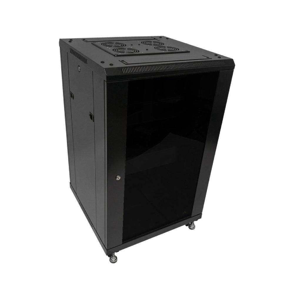 This 18U A/V and networking cabinet comes with a lockable glass front door, a lockable solid rear door and removable/lockable side panels. It comes assembled and pre-loaded with a four fan top, three vented shelves, solid blank filler panels and tapped rails. Cable entries are available on the top and bottom of the cabinet. There are also removable panels at the bottom of the cabinet for increased air flow. It is typically used in home installations, security applications, restaurants/bars and offices where server depth is not required.