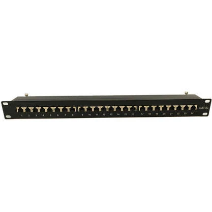 This 24 port Cat6a 1U shielded patch panel has shielded RJ45 female ports on the front and 110 punch-down style terminals on the rear. It has a built in cable manager and is meant to be mounted on a 19″ rack or cabinet. It provides an easy method to terminate raw Cat6a shielded cable runs.