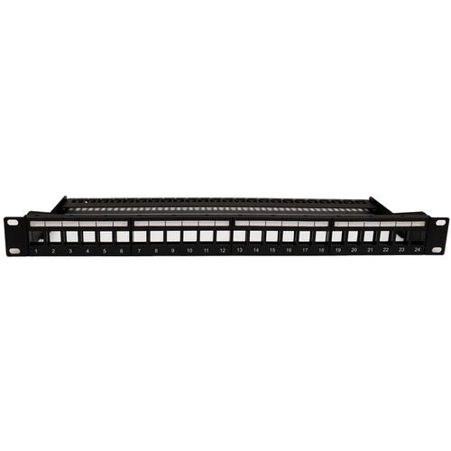 This 24 port patch panel comes unloaded and is 1U in height. It can be fitted with standard networking and audio/video keystone inserts and is meant to be mounted on a 19 inch rack or cabinet. It gives you the flexibility to customize the panel to your specific installation requirements. It also comes built in with cable management.