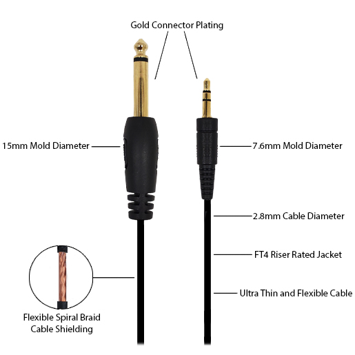 Slim Connector DesignThe connector moldings have a slim profile to fit properly in today’s compact electronic devices. Flexible Cable ShieldingThis audio cable features 85% tin copper spiral braid cable shielding for increased flexibility. Ultra-Thin Cable with a Riser Fire Rated JacketThe ultra-thin cable comes in a FT4 riser fire rated jacket for in-wall use. |