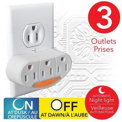 3-Outlet wall tap with polarized grounded outlets and automatic night light. Color – Off-white.