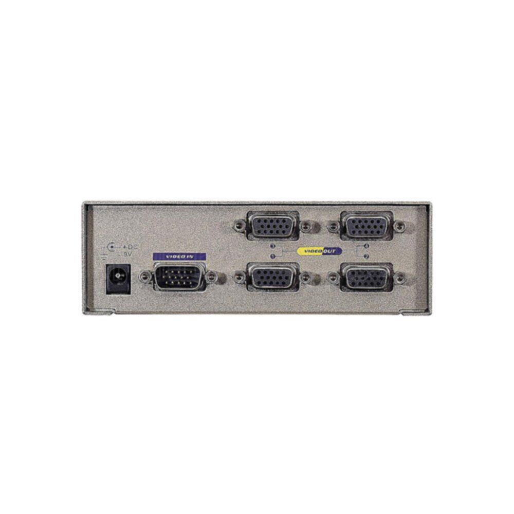 This VGA splitter enables you to display one VGA source on four VGA displays simultaneously. It is typically used to split a PC’s VGA video output to four VGA monitors or projectors.
