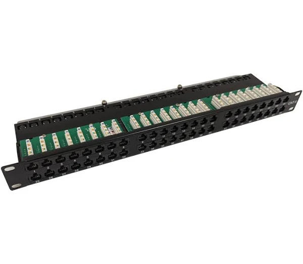 This 48 port Cat6 1U patch panel has RJ45 female ports on the front and 110 punch-down style terminals on the rear. It is meant to be mounted on a 19″ rack or cabinet and provides an easy method to terminate raw Cat5e and Cat6 runs.