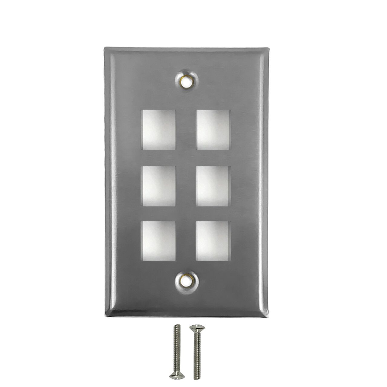 This wall plate consists of a 6-port keystone openings. It is a standard North American wall plate which accepts standard keystone inserts.
