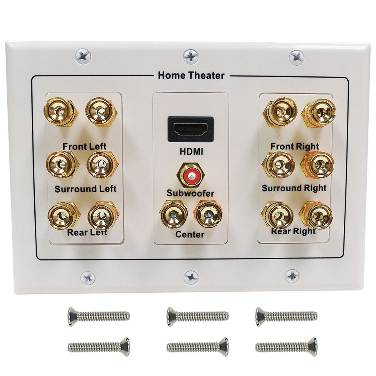 This triple gang wall plate kit consists of 7 pairs of Banana Clip female to female inserts (red and black), 1 red RCA subwoofer female to female insert and 1 HDMI female to female insert. It is typically used to install a 7.1 surround sound home theater system. It is compatible with standard North American electrical openings, data clips or surface mount boxes.