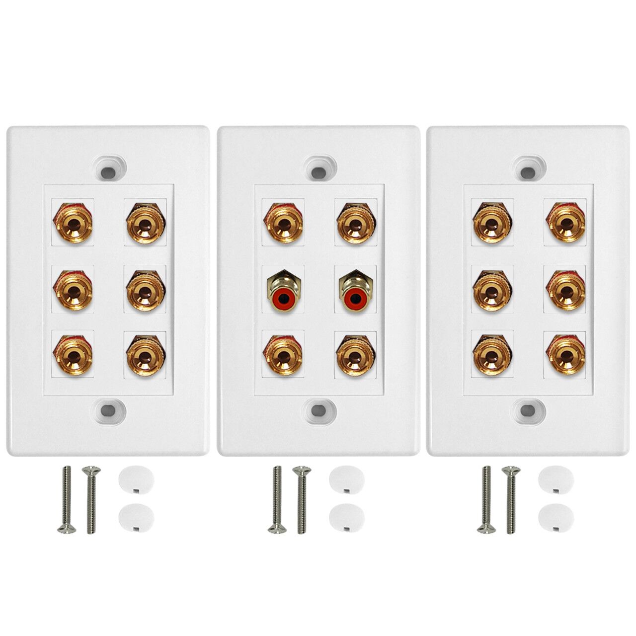 This 8.2 Surround Sound wall plate kit consists of a wall plate, 8-pair of Banana Clip female to female inserts, and a pair of RCA audio (subwoofer) female to female port. It is compatible with standard North American electrical openings, data clips or surface mount boxes.