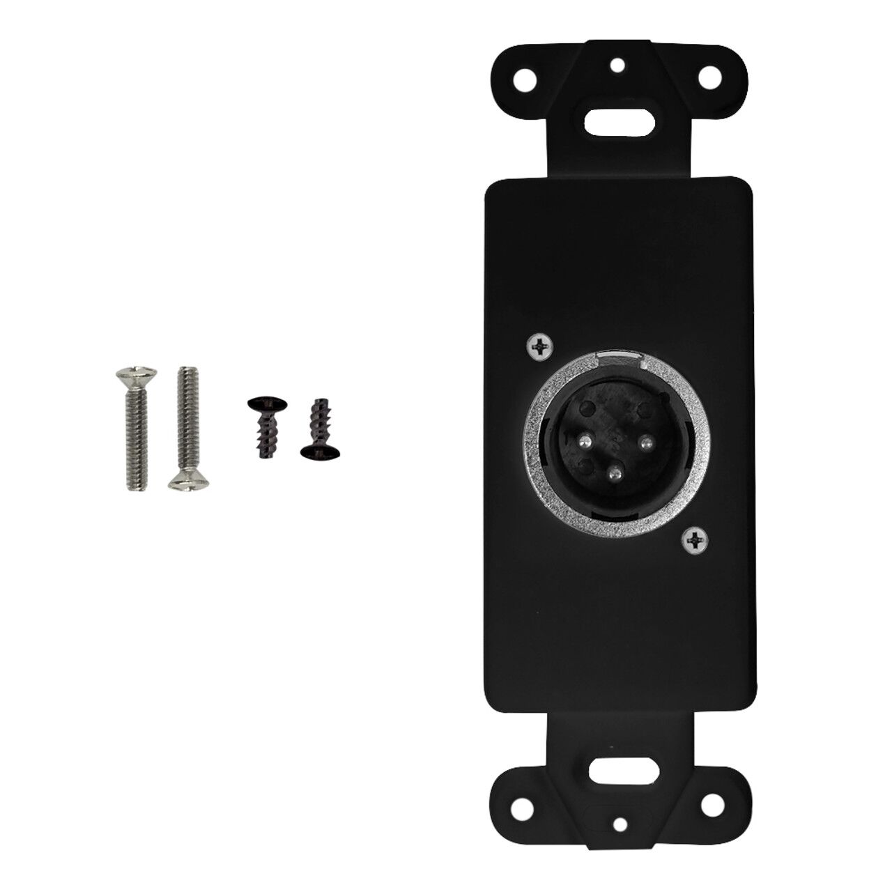 This wall plate kit consists of a decora strap, and a XLR female locking to solder insert. It is designed to fit single gang decora wall plates. It is compatible with standard North American electrical openings, data clips or surface mount boxes.