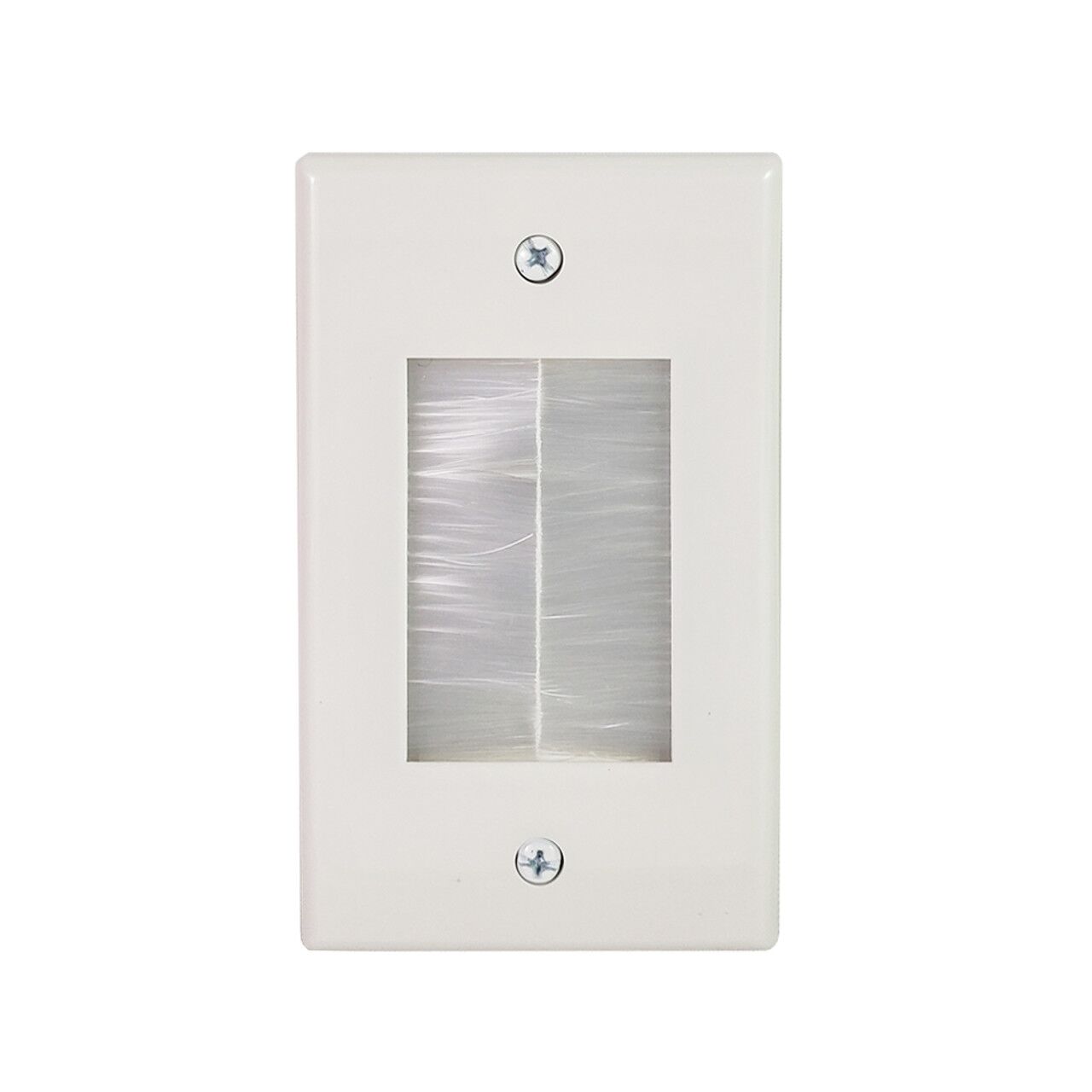 This single gang brush style wall plate consists of a cable pass-through opening. It has a built-in plastic wall clip which saves time and money. Intended for use on existing construction.