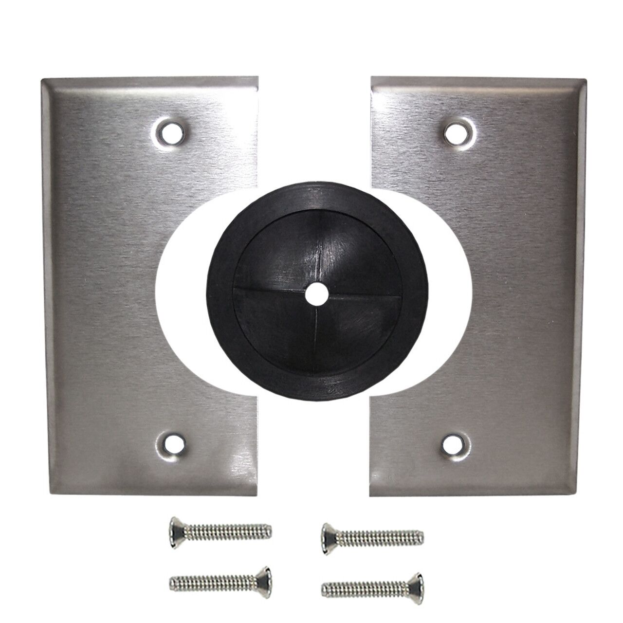 This split double gang wall plate consists of a cable pass-through opening. The split design allows you to attach the wall plate after cables have been run. The grommet diameter is 1 B> inch wide. This wall plate is made of stainless steel.