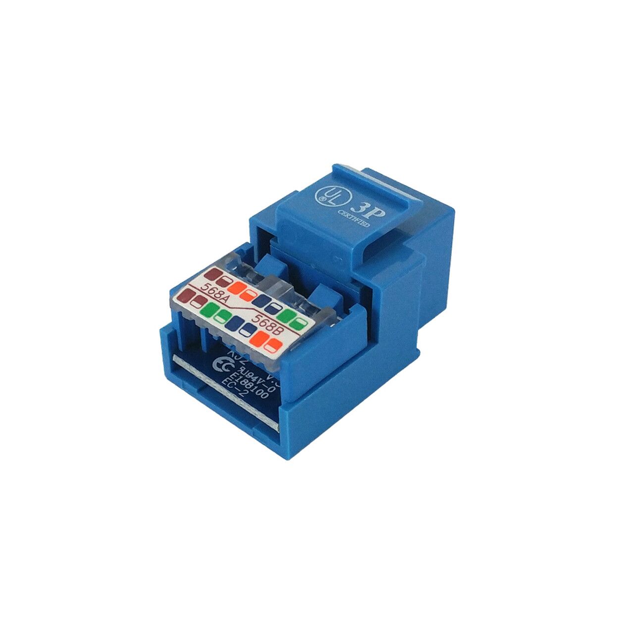 This keystone jack consists of a RJ45 Cat5e female on one end and a tool-less punch-down connection on the other. It is typically used to terminate a CAT5e UTP cable and snap into a standard keystone opening.