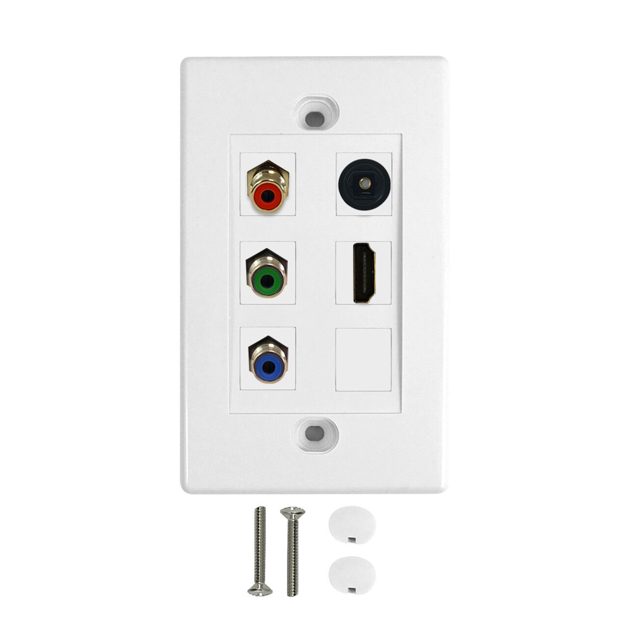 This wall plate kit consists of a wall plate, plus 3x Component (RGB) female to female ports, a HDMI female to female port, and Toslink audio female to female port. It is compatible with standard North American electrical openings, data clips or surface mount boxes.