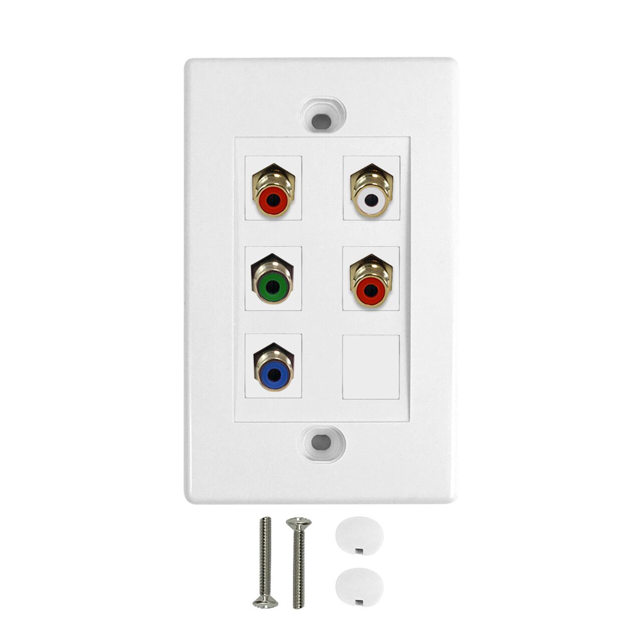 This wall plate kit consists of a wall plate, plus 3x Component (RGB) female to female ports, and 2x RCA audio female to female ports. It is compatible with standard North American electrical openings, data clips or surface mount boxes.