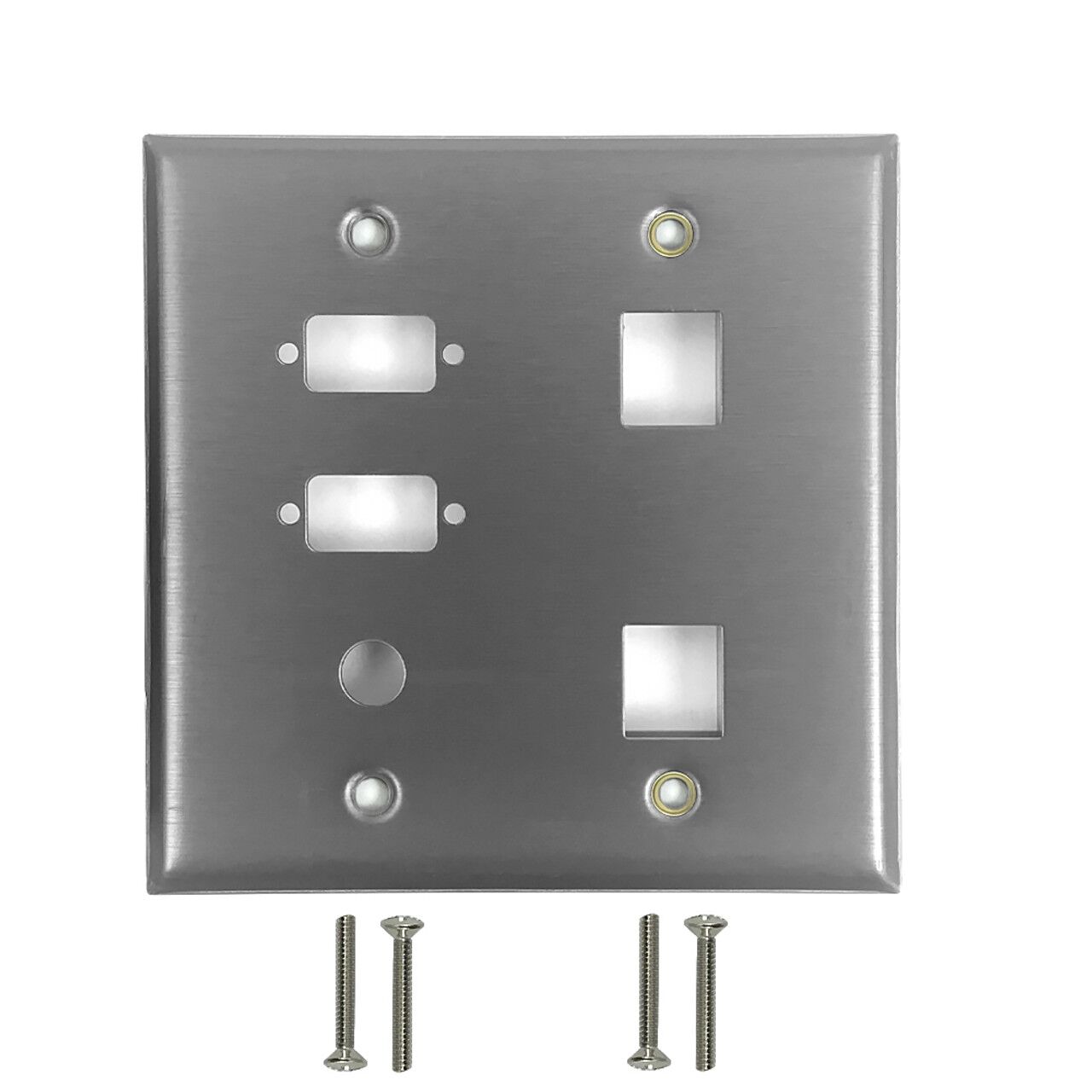 This wall plate consists of two DB9 size openings plus a 3/8 inch hole and two standard keystones holes. It is a standard North American wall plate which accepts a variety of our DB9 style couplers or dongles (such as HDMI, VGA, USB and DisplayPort), 3/8 inch sized couplers (such as RCA, F-Type and 3.5mm) and standard keystone inserts.