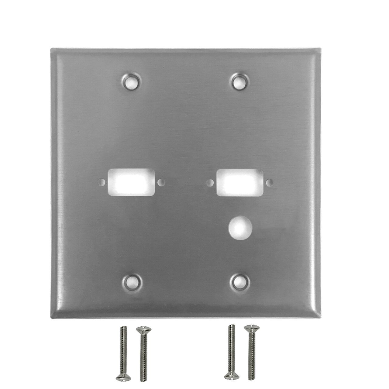 This wall plate consists of two DB9 size openings plus a 3/8 inch hole. It is a standard North American wall plate which accepts a variety of our DB9 style couplers or dongles (such as HDMI, VGA, USB and DisplayPort), 3/8 inch sized couplers (such as RCA, F-Type and 3.5mm).