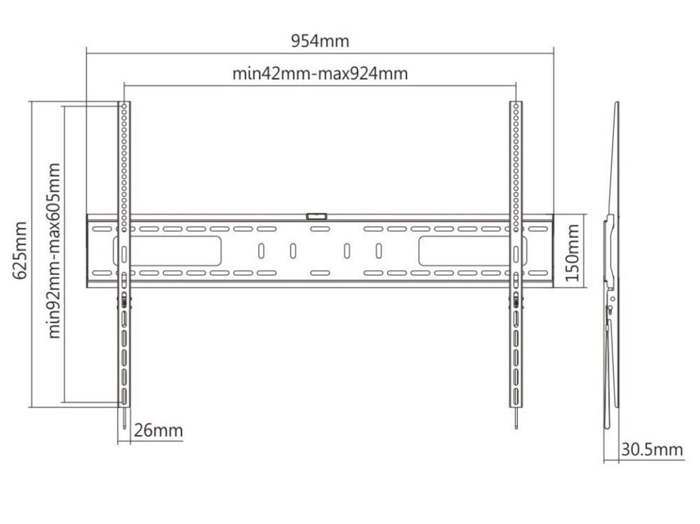 The large low profile fixed wall mount can accommodate most 60″-100″ LED, LCD Flat Panel TVs with a maximum weight of 75kgs/1650lbs.The applicable screen size is almost twice as large as that classic ones. Slim design sits just 30.5mm from wall to complement the sleek look of ultra-thin TVs. Its automatically click-in spring lock with easily-release cord easily and securely attaches flat panels to wall. Compatible with VESA hole up to 605×924. In addition, it’s suitable for curved TV. Simple construction enables easy installation.