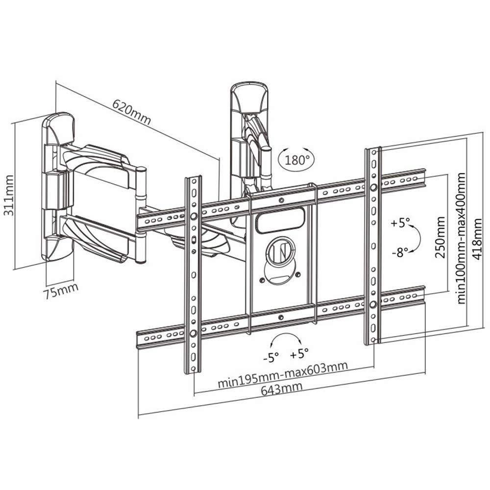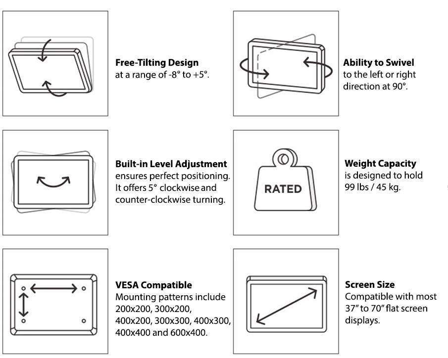Full Motion Makes any Seat, the Best SeatThe tilt and swivel motion of the mount allows you to position your TV to the best viewing angle, and provide the maximum viewing experience. This mount can be swivel to the left or right direction at 90° – and tilted at a range of -8° to 5°.