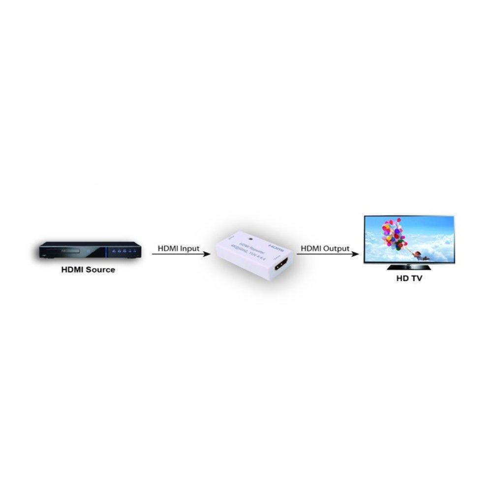 This 4K*2K HDMI repeater consists of HDMI female ports on both ends. It is used to extend the length of a HDMI cable by boosting the HDMI source signal before outputting it to a HDMI display.