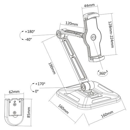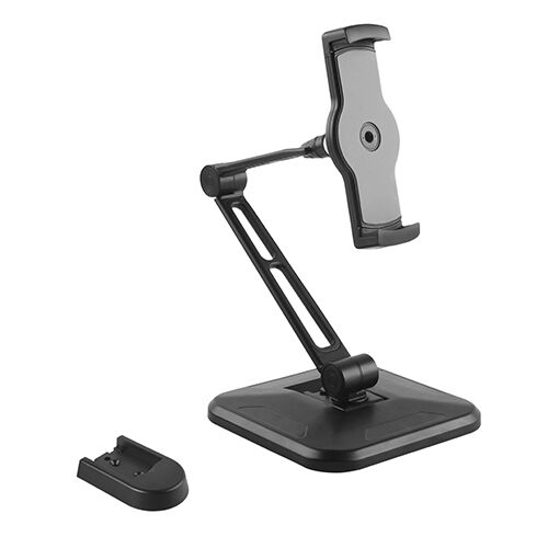Foldable, Flexible and VersatileThe unique design of this universal phone/tablet stand makes it easy to place your device on a desk/tabletop or mount it on any wall or flat surface. It has an adjustable holder that fits a wide range of devices with a screen size of 4.7 inches to 12.9 inches. It grabs the device firmly while allowing maximum flexibility to tilt, swivel and rotate 360° so you can effortlessly change from portrait to landscape, as well as adjusting the viewing angle Solid, Multi-purpose StandThe stand has large steel base for enhanced stability, and soft protective rubber cushions which hold you device securely but prevent scratches or damages. It also comes with an optional screw-on base which allows you to attach the mount on a wall or under a cabinet |