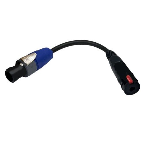 This audio speaker cable has a 2-pole speakON on one end and 1/4 inch female on the other. It is typically used to convert TS speaker cables to speakon in connections between amplifiers pro audio speakers.