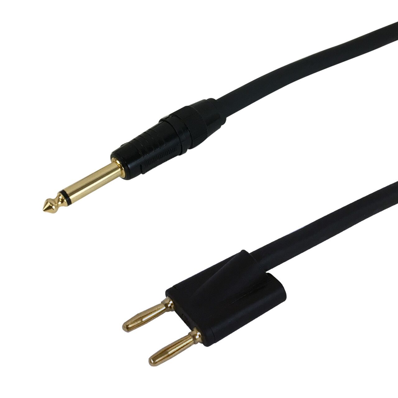 This audio speaker cable has a dual banana clip male connector on one end and a 1/4 inch TS male connector on the other. It is typically used to connect pro audio speakers to amplifiers.