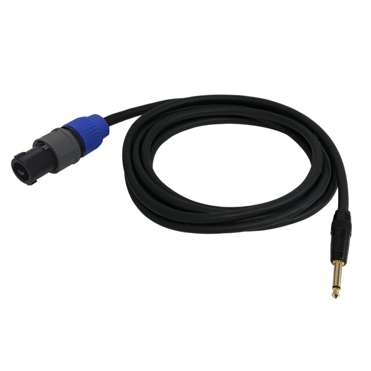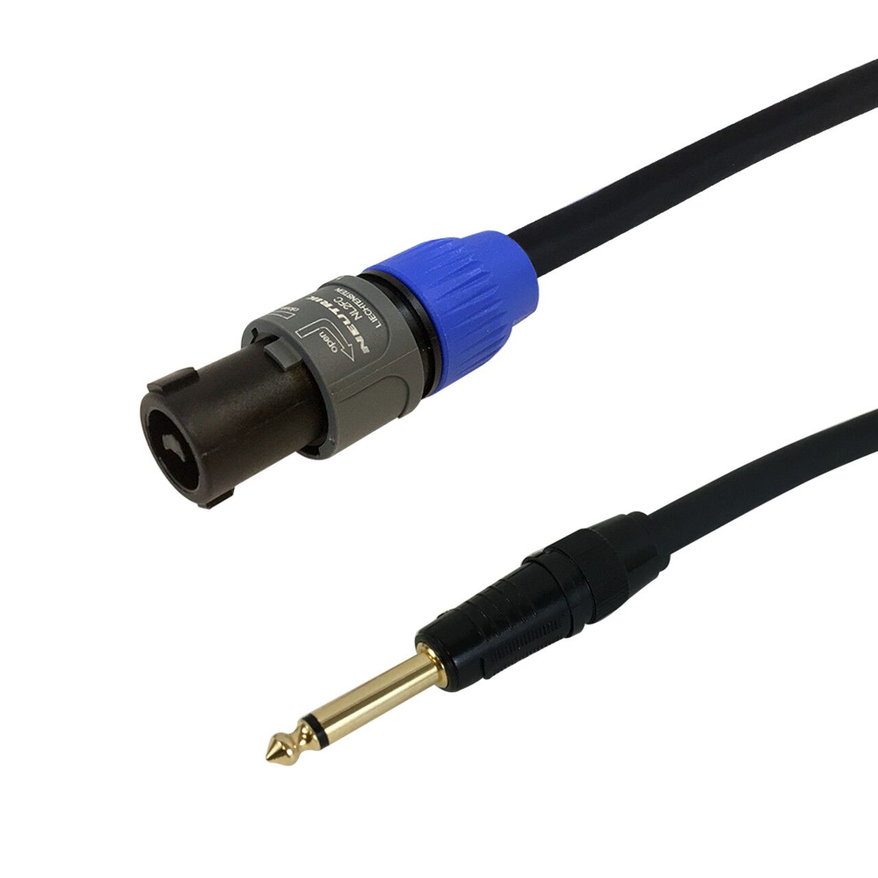 This audio speaker cable has a 2-pole speakON on one end and 1/4 inch TS male on the other. It is typically used to connect pro audio speakers to amplifiers.