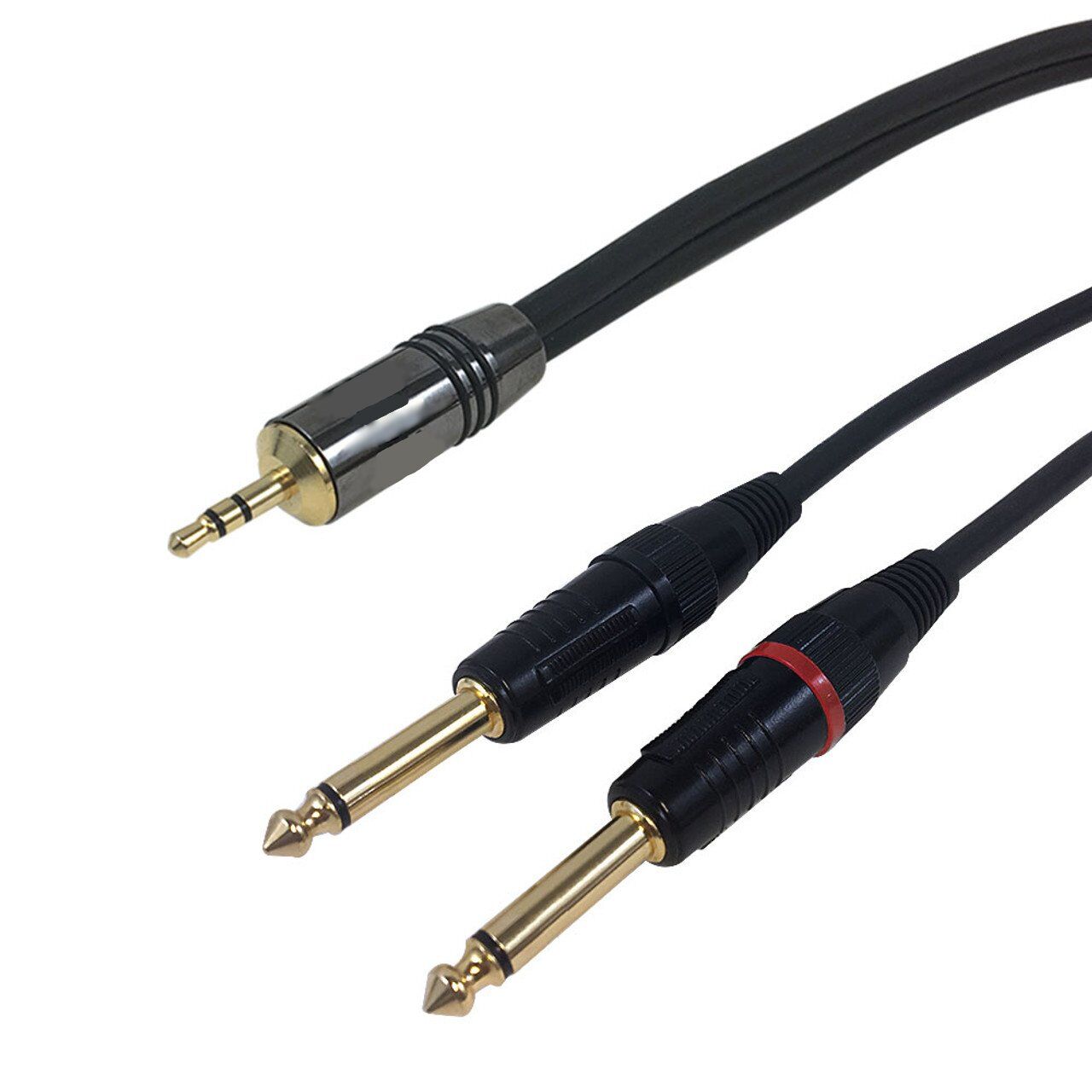 This stereo audio cable has a 3.5mm male on one end and two 1/4 inch TS male connectors on the other. It is typically used to connect audio devices such as PCs and stereo systems to the input of unbalanced pro audio equipment.