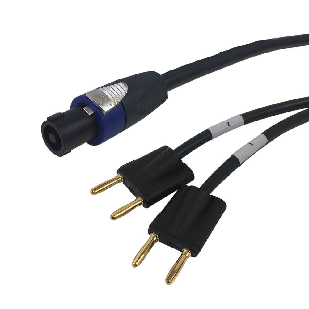 This audio speaker cable has a 4-pole speakON male on one end and two dual banana clip males on the other. It is typically used to connect pro audio speakers to an amplifier.