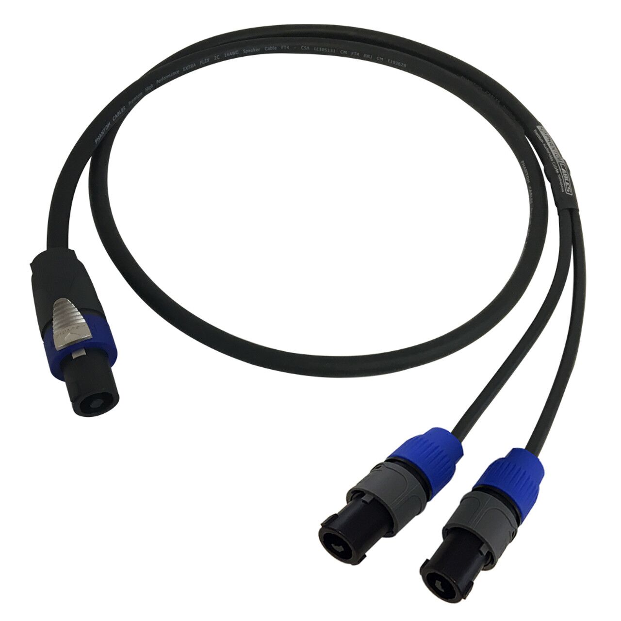 This audio speaker cable has a 4-pole speakON on one end and two 2-pole speakON on the other. It is typically used to connect pro audio speakers to an amplifier.