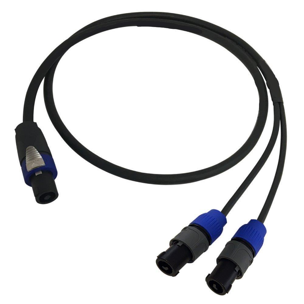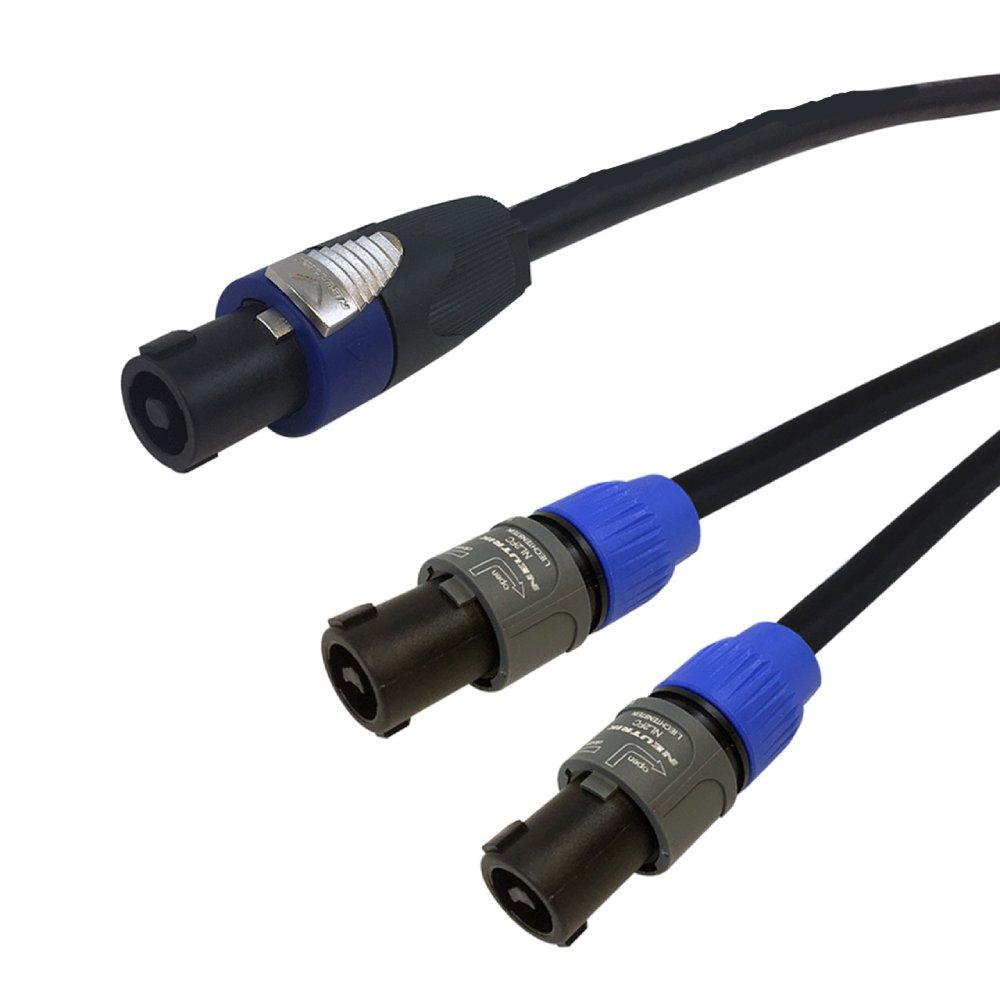 This audio speaker cable has a 4-pole speakON on one end and two 2-pole speakON on the other. It is typically used to connect pro audio speakers to an amplifier.
