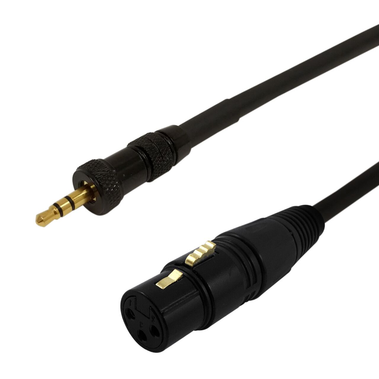 This audio cable has an XLR female on one end and a 3.5mm locking male on the other. It is typically used to connect a microphone to a wireless transmitter or camera.