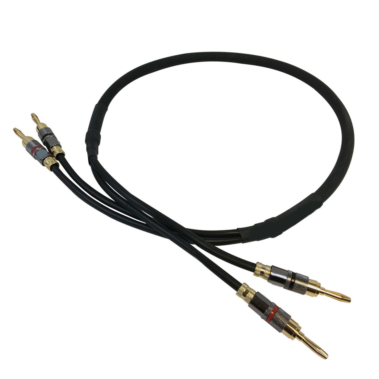 This audio speaker cable has two banana clip males on one end and two banana clip males on the other. It is typically used to connect speakers to amplifiers.