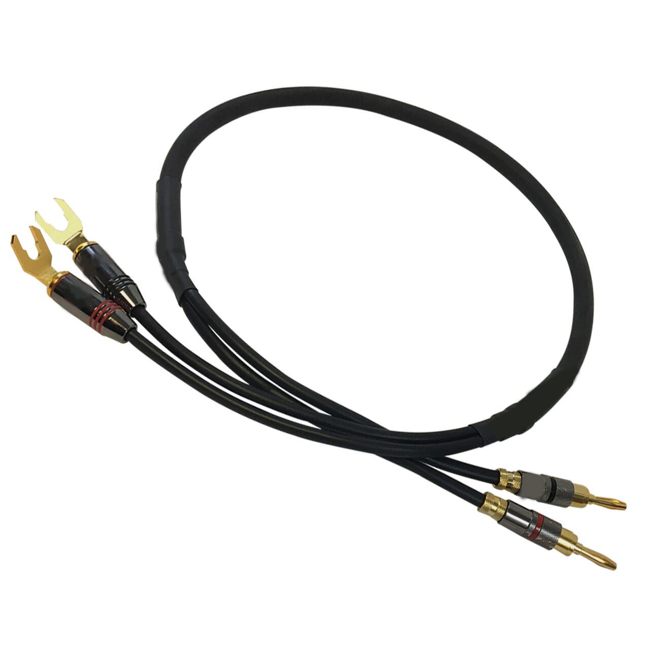 This audio speaker cable has two banana clip male connectors on one end and two spade lug male connectors on the other. It is typically used to connect speakers to amplifiers and receivers.