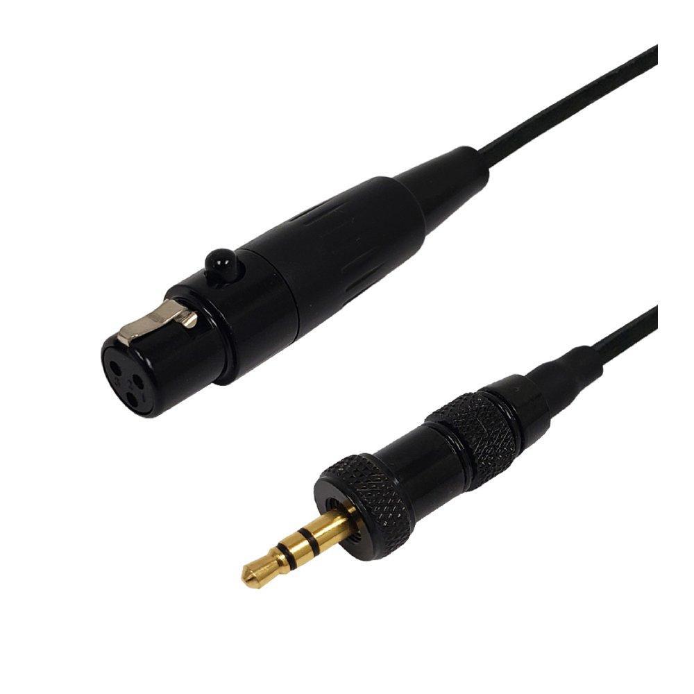This audio cable has a mini-XLR female on one end and a 3.5mm locking male on the other. It is typically used to connect a headset or lav microphone to a wireless transmitter or camera.