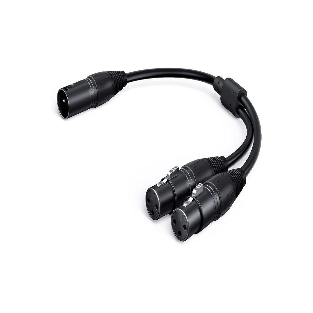 This splitter cable has an XLR male on one end and two XLR females on the other. It is typically used to split a microphone or XLR output into two duplicate balanced channels.