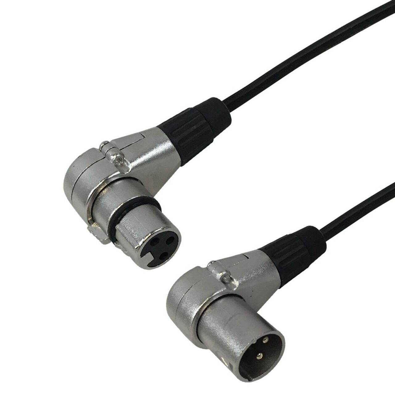 This premium stereo audio cable has a XLR male connection on one end and a XLR right angle female connection on the other end. It is typically used to connect audio devices such as powered speakers to mixers or as a microphone cable.