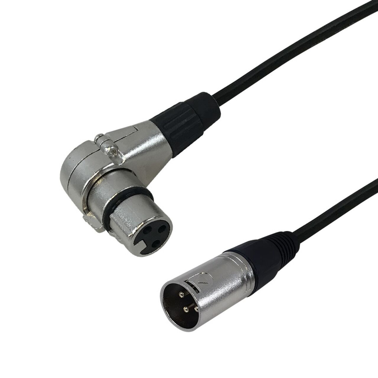 This premium stereo audio cable has a XLR male connection on one end and a XLR right angle female connection on the other end. It is typically used to connect audio devices such as powered speakers to mixers or as a microphone cable.