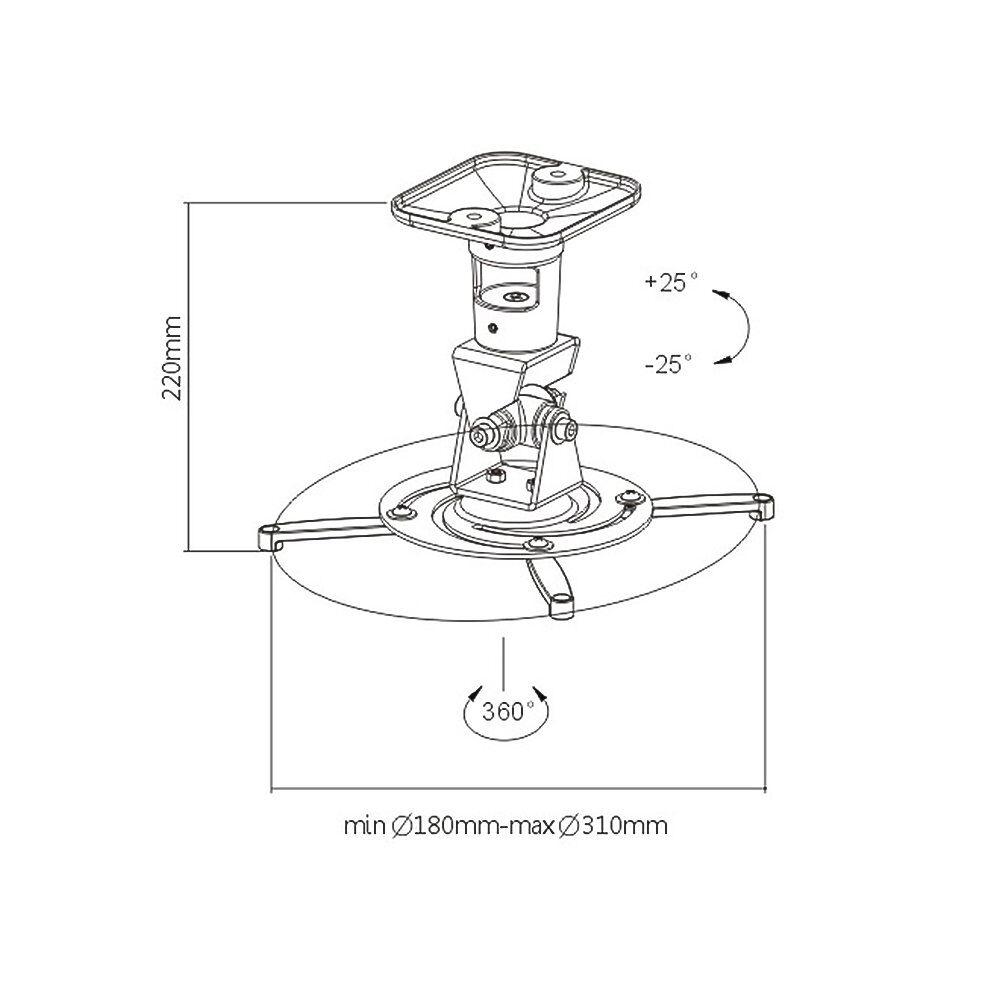 This ceiling mount projector is designed to hold projectors up to 15kgs/33 Ibs. It offers a up to 360° rotation, -25° to 25° tilt/swivel and has an adjustable length of 220mm. It can be used in both residential and commercial environments.