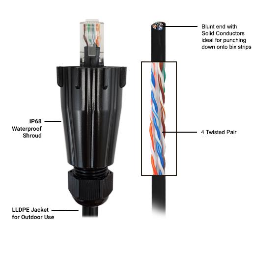 This Cat6 UTP gel filled outdoor UV direct burial Ethernet cable consists of RJ45 male with IP68 rated shroud on one end and and has no termination on the other. The un-terminated end is typically used for punching down onto a jack or panel and the IP68 shroud is intended to mate with our IP68 rated couplers for a weather tight seal. It is typically used outdoors either above or below ground as premise wiring to connect network devices.