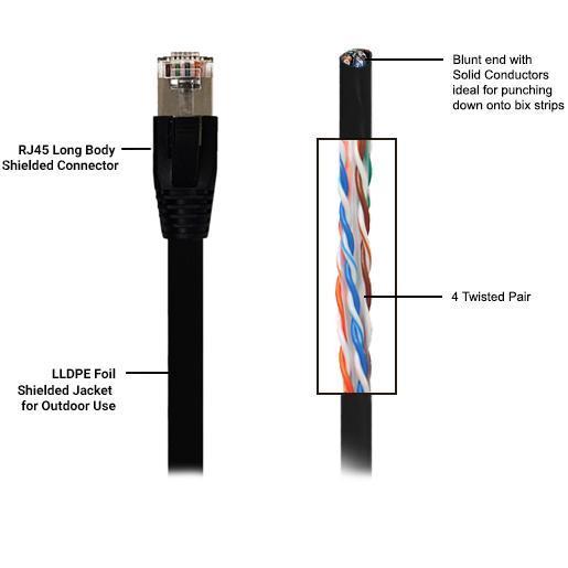 This Cat6 FTP outdoor UV direct burial ethernet cable consists of a RJ45 male on one end and a RJ45 male on the other. It is typically used outdoors either above or below ground as premise wiring to connect network devices.