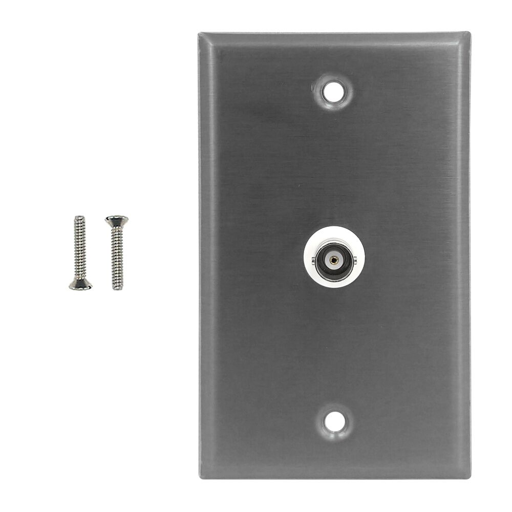 This stainless steel wall plate kit consists of a wall plate, and a 50ohm BNC female to female port. It is compatible with standard North American electrical openings, data clips or surface mount boxes.