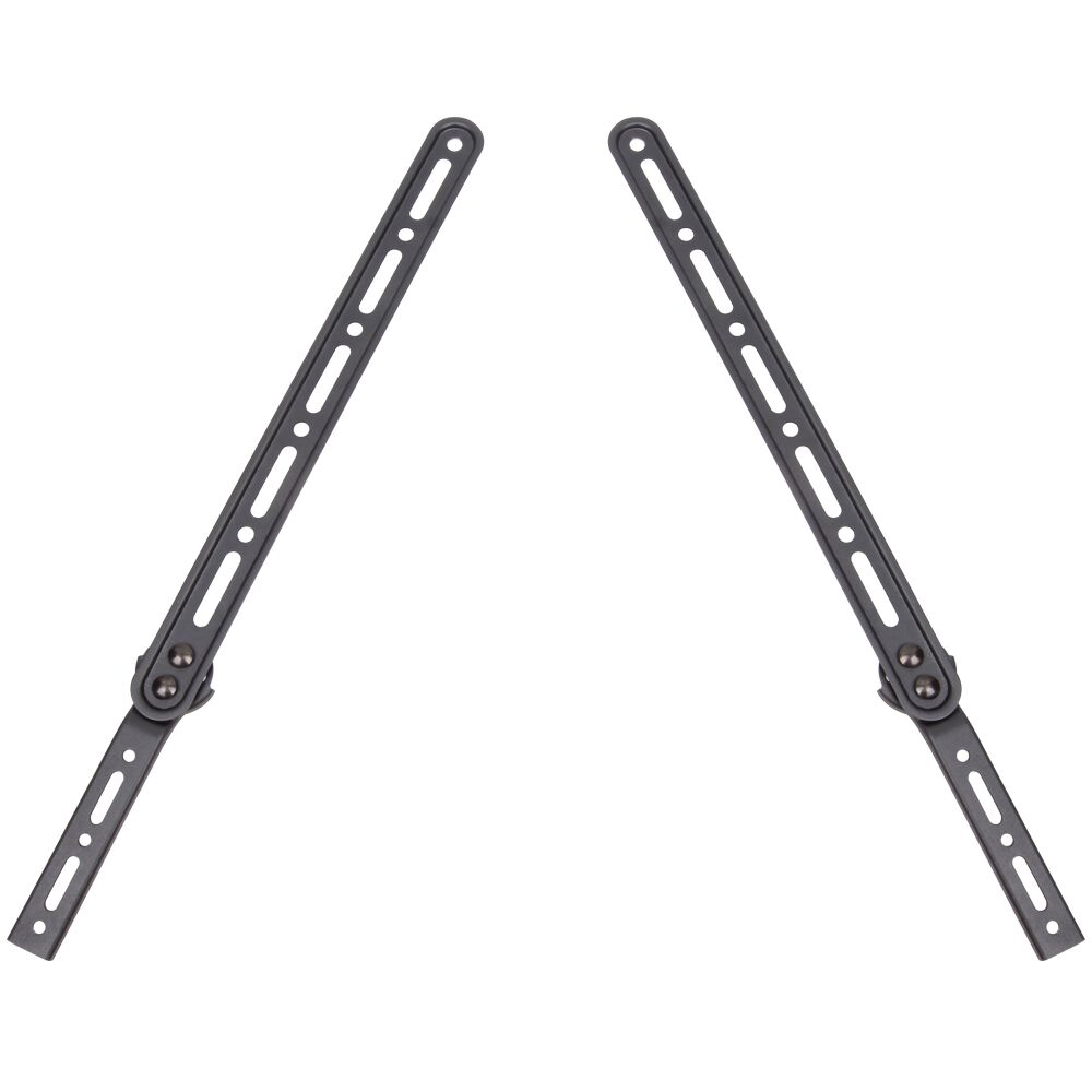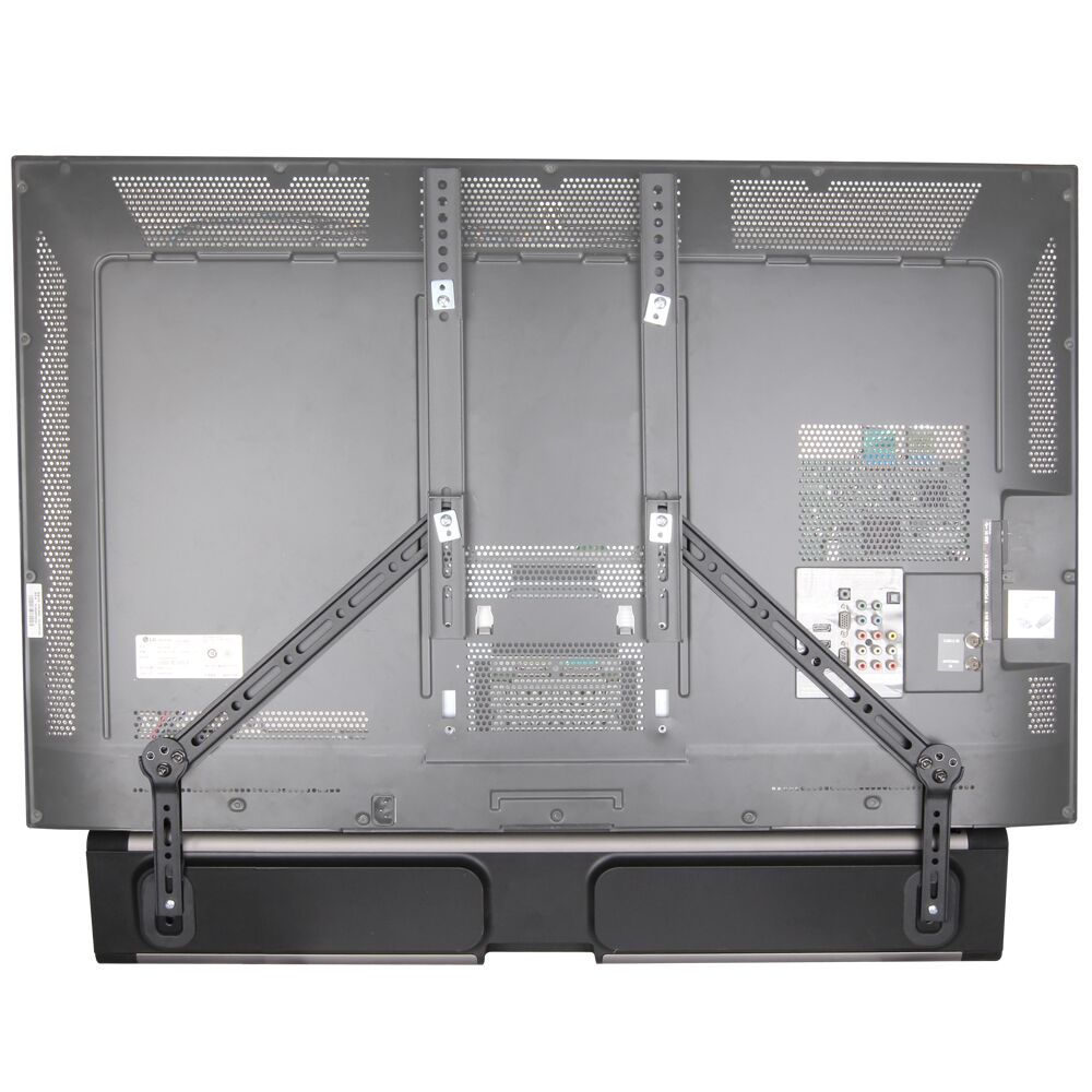 This sound bar bracket is designed to hold speakers up to 15kgs/33 lbs. It attaches to the back of the TV under the wall mount bracket and holds the sound bar in place.