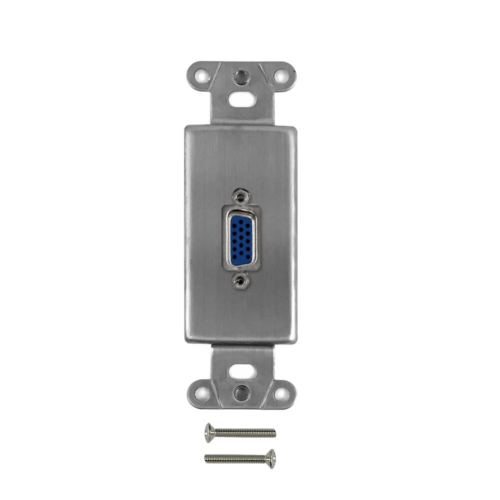 This wall plate kit consists of a stainless steel decora strap, and a VGA female to female insert. It is designed to fit single gang decora wall plates. It is compatible with standard North American electrical openings, data clips or surface mount boxes.