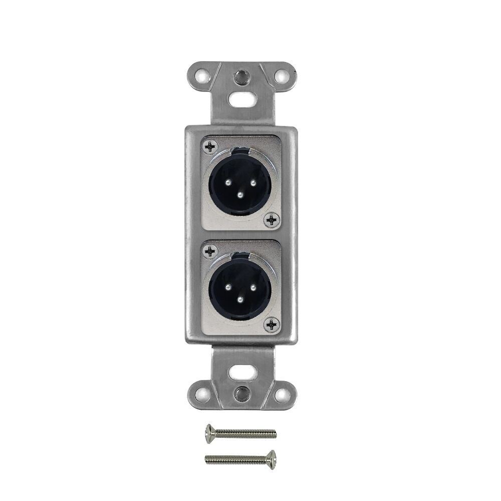 This wall plate kit consists of a stainless steel decora strap, and 2x XLR male to solder insert. It is designed to fit single gang decora wall plates. It is compatible with standard North American electrical openings, data clips or surface mount boxes.
