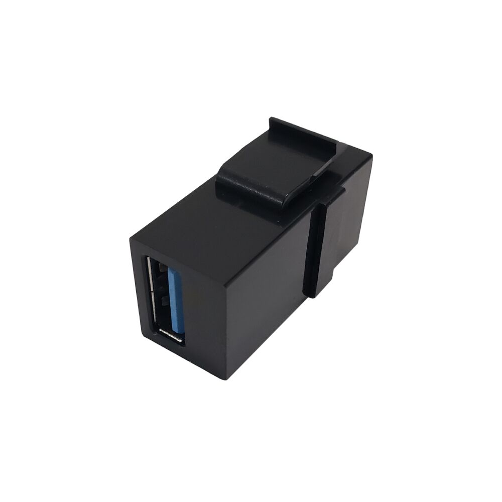 This keystone adapter consists of a USB A 3.0 on one end and a USB A 3.0 on the other end. It is typically used to snap into a standard keystone opening and connect a USB A 3.0 cable coming from within the wall to a USB B 3.0 cable going to a source.