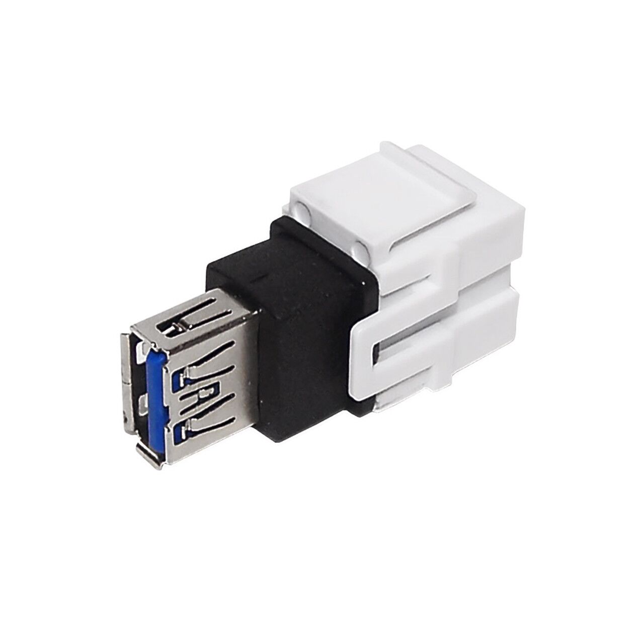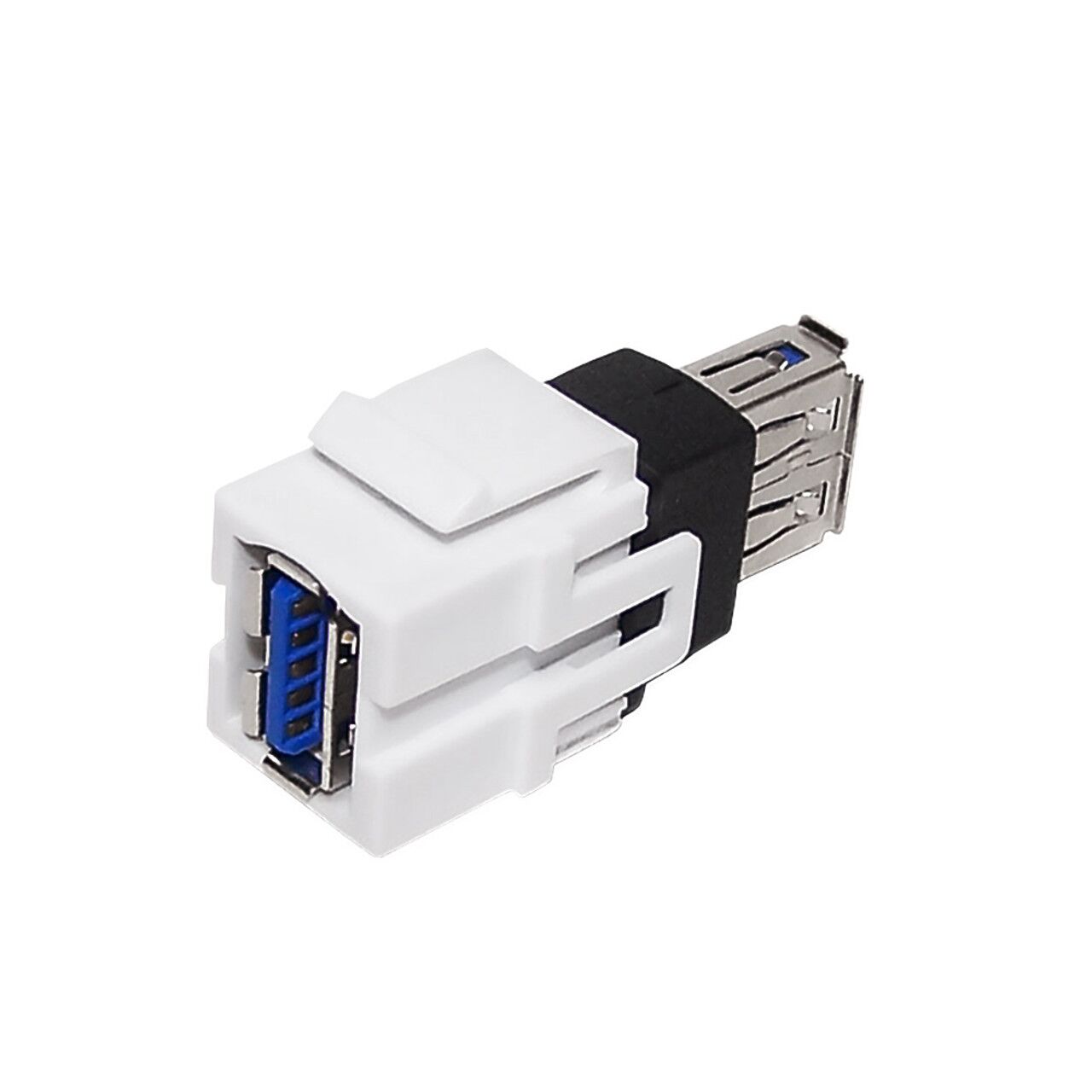 This keystone adapter consists of a USB A 3.0 on one end and a USB A 3.0 on the other end. It is typically used to snap into a standard keystone opening and connect a USB A 3.0 cable coming from within the wall to a USB B 3.0 cable going to a source.