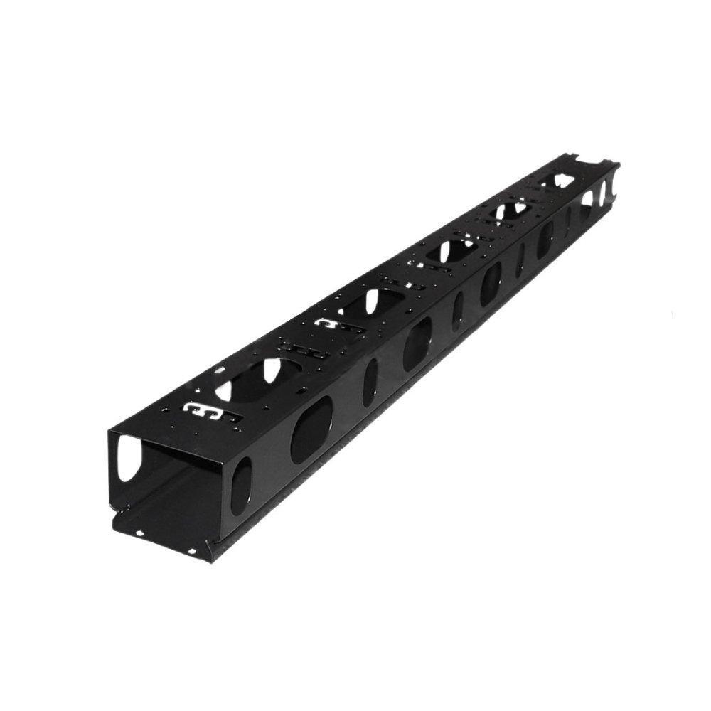 The vertical cable manager is 42U in height, has oval cable pass through openings and a hinged cover for easy access to cabling. It is typically used to organize cables running vertically on relay racks.